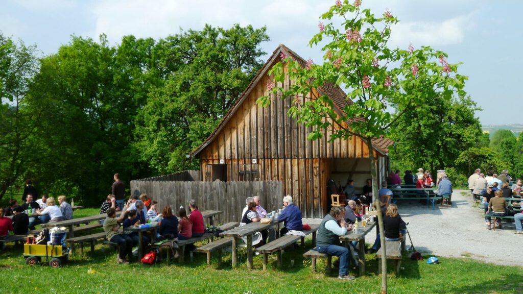 Hoch oben auf dem Gelände des Hohenloher Freilandmuseums Wackershofen, am höchsten Punkt des Areals, liegt der idyllische Sommerkeller. Hier eröffnet sich eine der schönsten Aussichten über das gesamte Museumsgelände und die weite Hohenloher Ebene – ein Panorama, das bei klarem Wetter einfach begeistert. Der Biergarten erstreckt sich auf einer grünen Wiese direkt am Waldrand, umgeben von der ruhigen Natur der Waldberge. Neben dem historischen Sommerkeller-Gebäude aus Weipertshofen laden gemütliche Sitzplätze zum verweilen ein. Hier genießen Sie naturtrübes Bier vom Fass, Erfrischungsgetränke und kleine Imbissgerichte.